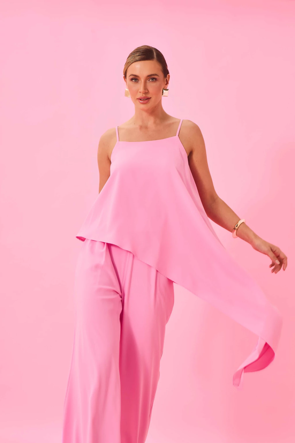 Conjunto de calça e túnica no tecido crepe com caimento fluido.