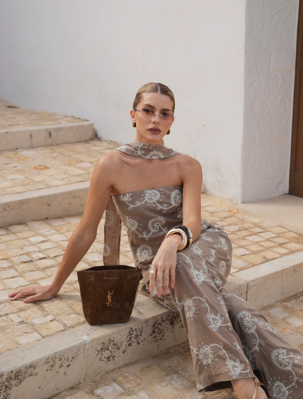 Este conjunto sofisticado, composto por pantalona e blusa tomara que caia, é confeccionado em Visco Linen bordado, um tecido nobre que combina a leveza da viscose, a textura do linho e o conforto do algodão (85% viscose, 10% linho, 5% algodão). O bordado delicado acrescenta um toque artesanal e exclusivo, perfeito para quem busca um look refinado e contemporâneo.