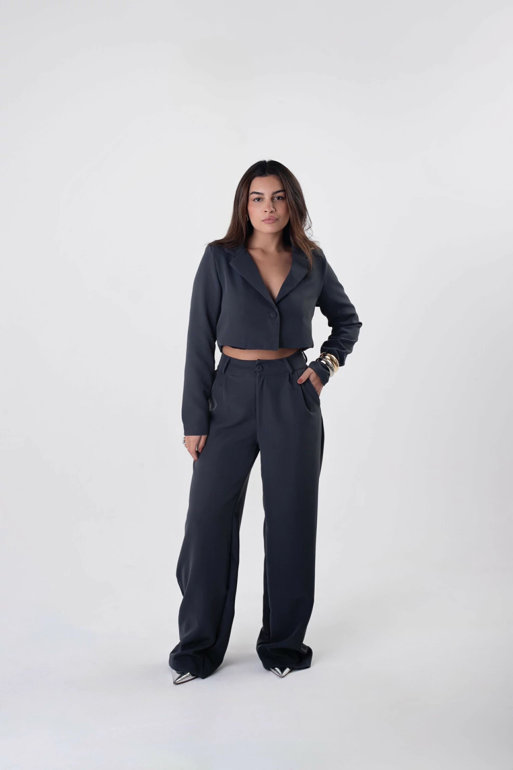 Confeccionada em crepe alfaiataria, cós acinturado e bolsos.