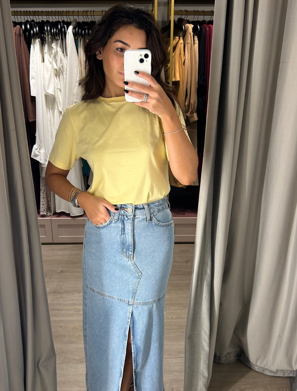 Sua modelagem clássica, que não é nem ampla nem slim, adapta-se a todos os tipos de corpo, garantindo um caimento impecável e sofisticado. A cor amarelo manteiga, tendência da estação, traz um toque suave e luminoso para o guarda-roupa, elevando qualquer look com discrição e charme.