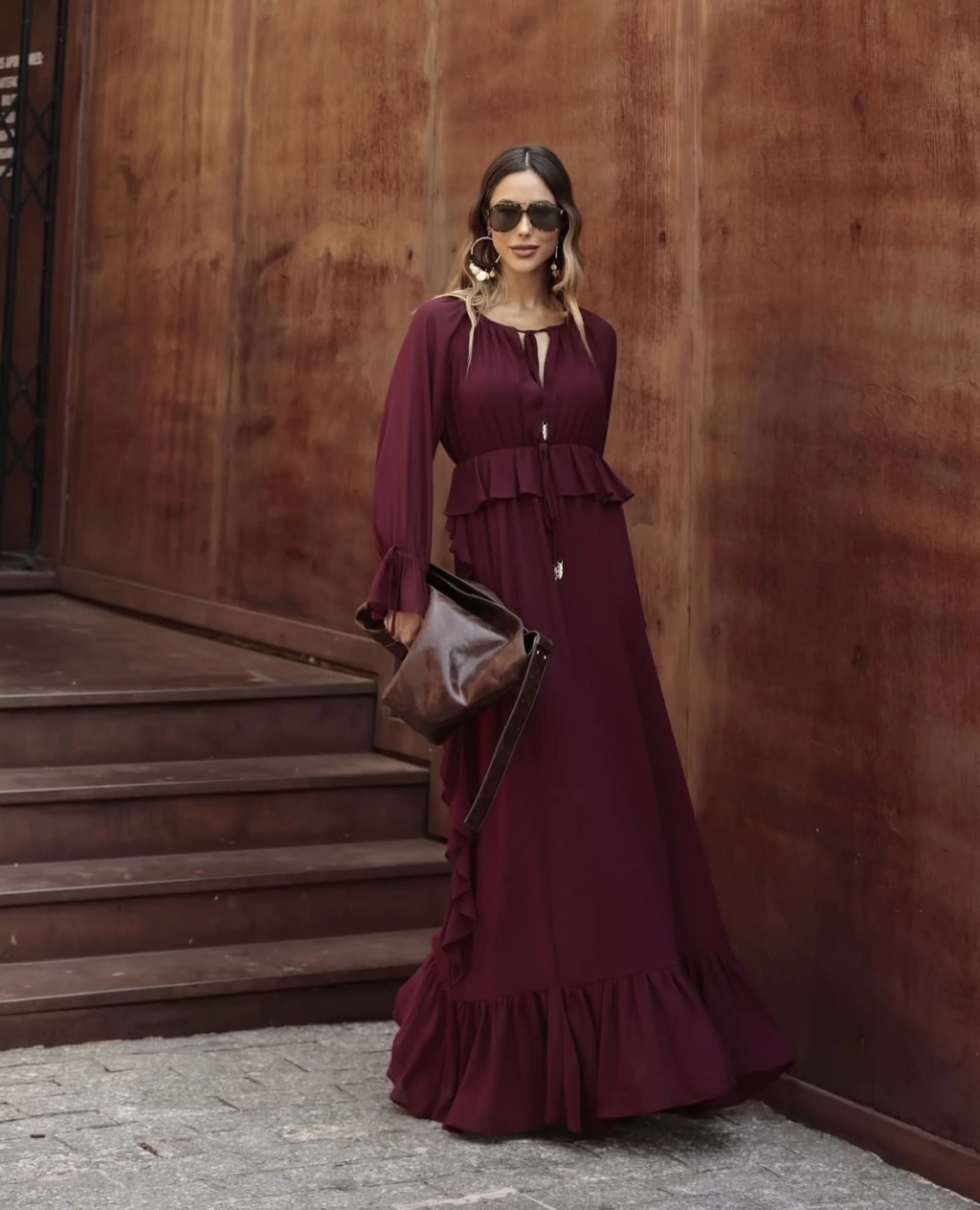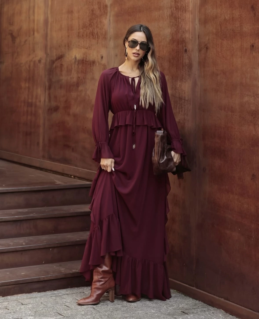 O Vestido Betina Bordô é a definição de elegância e sofisticação. Feito em chiffon fluido, este vestido longo destaca-se pelos babados encantadores, que trazem um toque boho ao visual.